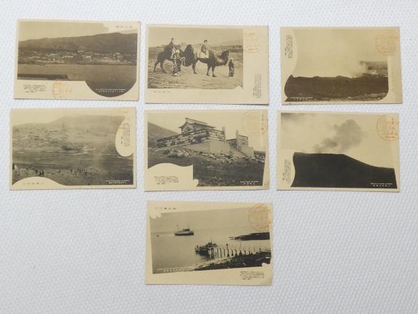 1000636■戦前 絵葉書■静岡県 伊豆 大橋 元村船着場浅橋 三原神社 三原山噴火 元村 全景 駱駝 ラクダ らくだ 女性着物 7枚