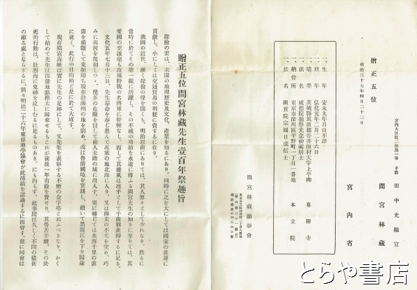 贈正五位間宮林蔵先生壱百年祭文献 深作安文宛封筒4通