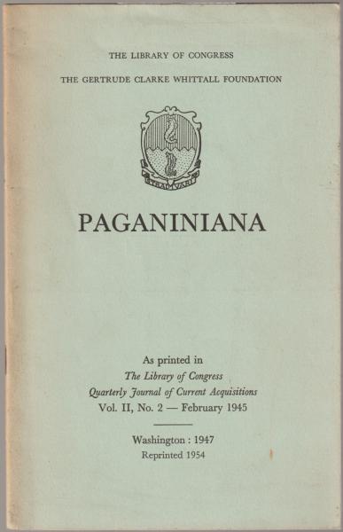 Paganiniana : the library of congress; the Gertrude clarke Whittall Foundation : As Printed in The Library of Congress Quarterly Journal of Current Acquisitions, Vol. II, No. 2 - February 1945. Repr.