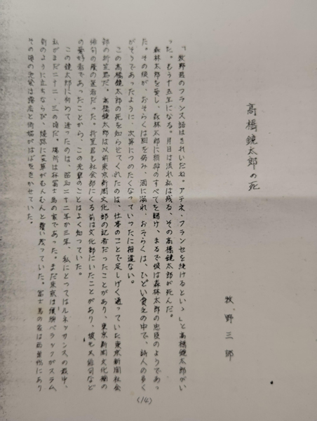 昨年刊行した『早く逝きし俳人たち』(文学通信)には12名の早世俳人を紹介したが、その中の1人に高橋鏡太郎がいる。『現代俳句大事典』(三省堂)にも立項されている俳人で忘れられた存在ではないが、石川桂郎や吉屋信子、上林暁の評伝の影響で、残した作品ではなく、その晩年の醜態ばかりがクローズアップされてきた。評伝の影響ばかりでなく、作品に触れることが難しいことが、そんな事態を招いていると考え、鏡太郎が参加した俳句誌『風流陣』『多麻』『琥珀』『春燈』などから俳句を抜き出した他、詩やエッセイ、評論類のタイトルを調べられた限り総て収録した。勿論、完璧には程遠く、事実、北園克衛たちとの『風流陣』に関しては埋もれていた第66冊の在処が判明して掲載句を紹介出来たが、迂闊にも見逃した作品が多数あることを友人から指摘されると共に、それらを具体的に教えてくれたので、参加している俳句同人誌『鬣』に掲載した。ところが今回の事務所整理中に、牧野三郎という方が書いた追悼文「高橋鏡太郎の死」のコピー2枚が出て来たので大いに驚いた。かなり時間が経過したコピーで、全く私には記憶がない。4頁あり「37・8・21夜」と書いた日時も分かる。鏡太郎の後見人とも言うべき俳人で酒亭ぼるがの主人高島茂が趣味誌『帖面』の特集号に掲載されたものはあるが、きちんとした追悼文を読んだ記憶がない。その中でこの牧野三郎の文章は内容も素晴らしく、今後どなたかが鏡太郎について書いたり話したりする場合は引用されるべきものと思う。全文ここに翻刻したいがスペース的に余裕がないので、写真を掲載する。拡大して見て頂ければ判読できる筈である。 〇追悼文「高橋鏡太郎の死」1 〇追悼文「高橋鏡太郎の死」2 〇追悼文「高橋鏡太郎の死」3 〇追悼文「高橋鏡太郎の死」4 御覧のようにガリ版印刷で、何に掲載された文章か分からないが、ノンブルが付いているので、恐らくはマイナーな同人誌に掲載されたのではないかと思う。井上康文と『自由詩』という雑誌を出していたというから、そこかもしれない。牧野三郎という人物も初めて知ったのだが、これまた驚いた事に、この方の詩集『声』(研進社・昭和41)も今回別の場所から出て来た。これはコピーを発見する前で、コピーを見て、あの詩集の牧野かと思ったのである。国会図書館デジタルコレクションで検索したら、中原道夫主宰の『棘』という同人誌にも参加していたことが分ったが、『詩学』に掲載された雑誌一覧の記述なので、詩の雑誌だと思うが不明である。現在活躍する俳人中原道夫とは別人である。 この追悼文から、いろいろ私の知らなかったことが分かる。鏡太郎が森鷗外を崇敬していたこと。牧野は鏡太郎の死を東京新聞の折笠君から知らされと書いているが、これは高柳重信等の『俳句評論』同人だった折笠美秋である。鏡太郎も東京新聞にいたことがあるというのも知らなかった。勿論二人が知り合いであったことも。そして何より、林富士馬が事実上の主宰者であった同人誌『新現実』に鏡太郎も参加しいて作品を発表していたという事実である。『新現実』を確認すれば、また鏡太郎の不名誉を挽回する作品に出会えるかもしれない。同誌は神奈川近代文学館にある程度所蔵があるようなので行くことにした。 牧野三郎が書いているように、終戦後の物資不足という事もあって『新現実』は薄い冊子で、現存は少ないだろう。神奈川近代文学館では一冊一冊保護袋に収められていた。『日本近代文学大事典』の林の項目は松本鶴雄さんが執筆しているが、戦時中に出していた伊東静雄たちとの同人誌『光耀』で三島由紀夫の才能をいち早く発見した詩人・評論家とあるほか、檀一雄らと『ポリタイア』を出していたことは解説されているが『新現実』には触れていない。同人に歌人近藤芳美や庄野潤三、大木実、野田宇太郎、後に社会党の代議士となった麻生良方などがいるが、全体に著名な文学者は少なく、林がそうであるように医者や、中心的な同人牧野徑太郎は詩人であると共に印刷業を営んでいたようで、市井の文学者による同人誌といった性格の雑誌であった。
